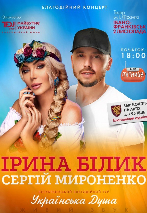 Цієї осені Благодійний Фонд «Майбутнє України 2050» оголошує Всеукраїнський Благодійний Тур, в якому виступлять легенда української сцени Ірина Білик та Сергія Мироненко. Метою цього туру є збір коштів для придбання автомобілів, необхідних для українських військових з 95 ДШБ ЗСУ, які невпинно борються за нашу країну.